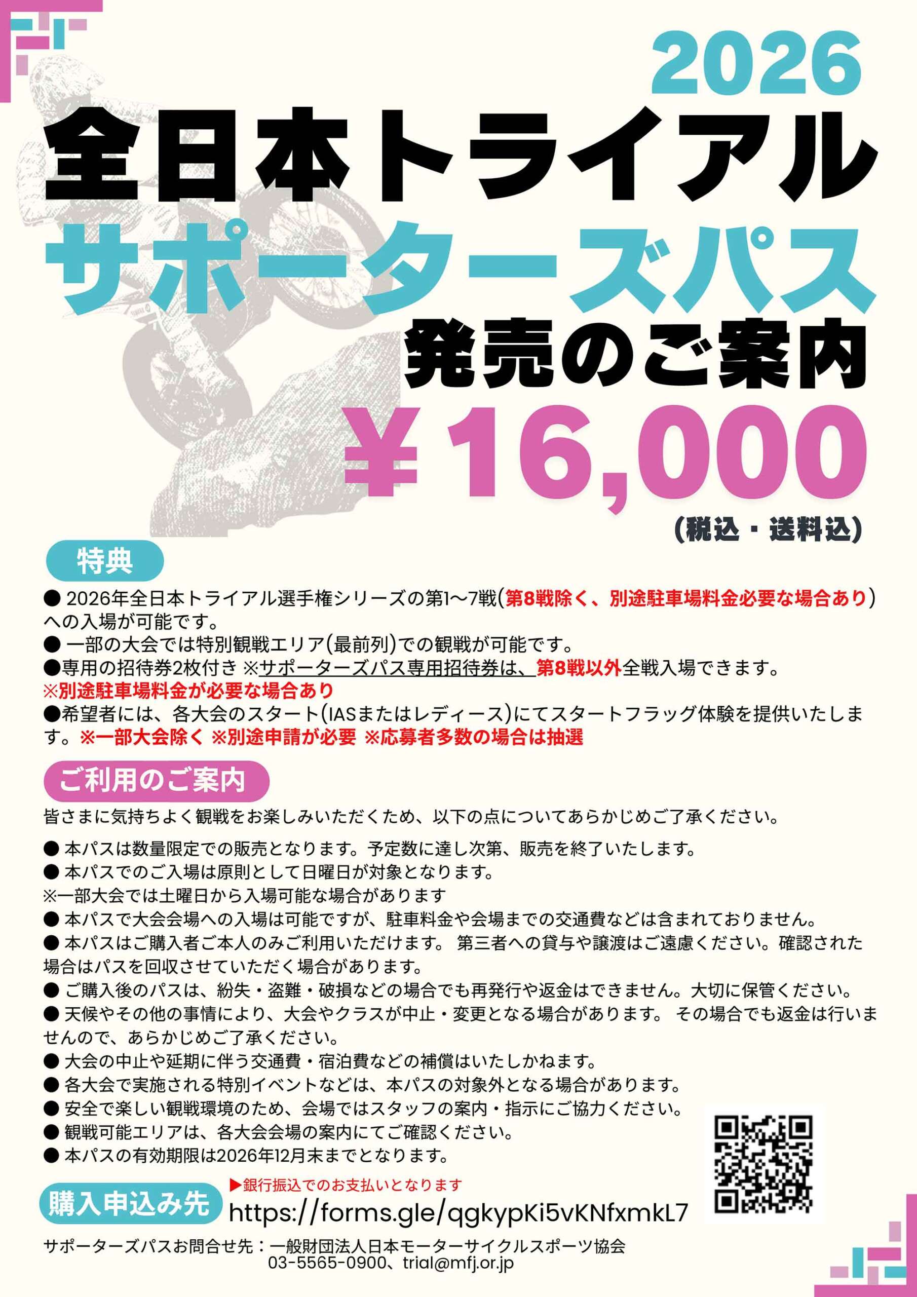 2026MFJ全日本トライアル選手権シリーズでは、「2026全日本トライアルサポーターズパス」を販売いたします。購入希望の方は下記をご確認いただき、専…