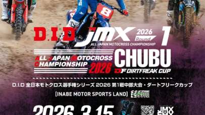2026.3.15(Sun.) 開催 ▼ チケット情報はこちら エントリーリスト ▼ タイムスケジュール ▼ 開催概要 ▼ 会場案内 タイムスケジュー … 続きを読む D.I.D全日本モトクロス選手権 2026第1戦 中部大会 ダートフリークカップ
