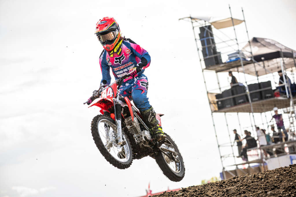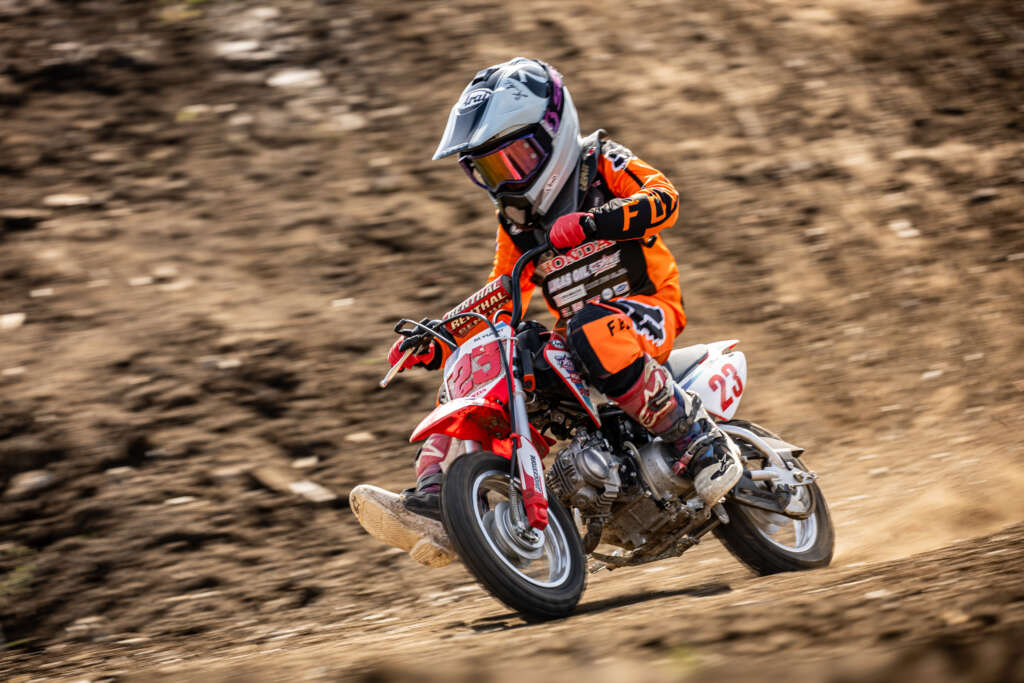 全30台が出場したHonda CRF125クラスでは、#64赤塚輝斗(T.E.SPORT Jr./ホンダ CRF125F)がトップで1周目を通過。#95塩畑達之(ProjectCarFactory/ホンダ CRF125F)、#16万木大夢(T.E.SPORT 陸上競技部/ホンダ CRF125F)が続く。赤塚は他のライダーより1秒ほど速いペースで周回し、徐々に後続との距離を拡大し単独走行へと持ち込む。一方2周目に2番手の塩畑が後退し、万木が2番手に浮上する。さらに、レース中盤には7番手あたりから#97荻原羚大(ElGanador97/ホンダ CRF125F)が追い上げ、3番手争いを展開。接戦となる中、荻原が制して3位に立ち後方を引き離す。結果、序盤で差を築いた赤塚が優勝を獲得。2位万木、3位荻原という順位でフィニッシュ。