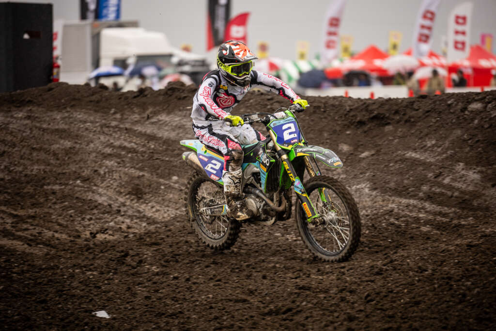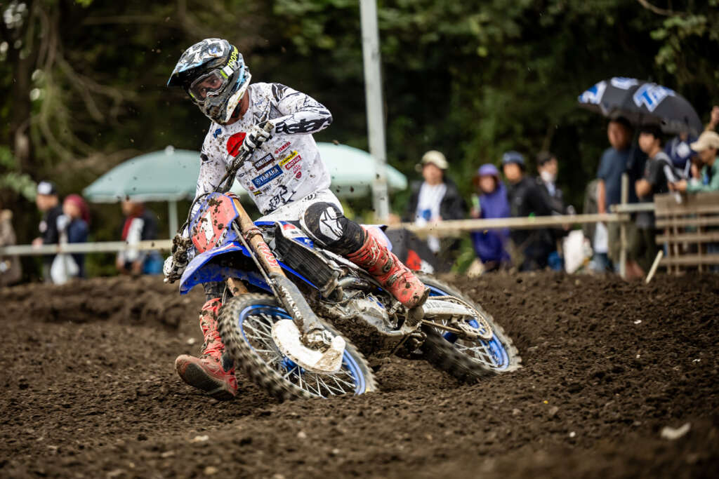 昼休みに散水され、さらに雨が降り始めたことで非常に滑りやすい路面となったヒート2。スタートで飛び出したのは#10内田篤基(Yogibo PIRELLI MOUNTAINRIDERS/カワサキ KX450)と#37西條悠人(KAWASAKI PURETECH Racing/カワサキ KX450)のカワサキ勢。1コーナーの混戦を抜け出しトップに立ったのは西條、2番手には#38浅井亮太(BLUCRUフライングドルフィンサイセイ/ヤマハ YZ450F)が続く。一方、ウィルソンはまたもスタートで出遅れたが、1周目から驚異的な追い上げを開始。レース序盤、浅井は転倒し後退。その後ウィルソンが2番手まで浮上し、トップを走る西條を追う。すぐにウィルソンは西條をパスしトップに立つと、そのまま独走態勢を築き、危なげなくヒート2も制した。2位にはIA1昇格後初の表彰台となる西條、3位には大倉が入った。