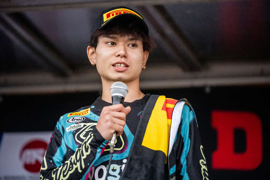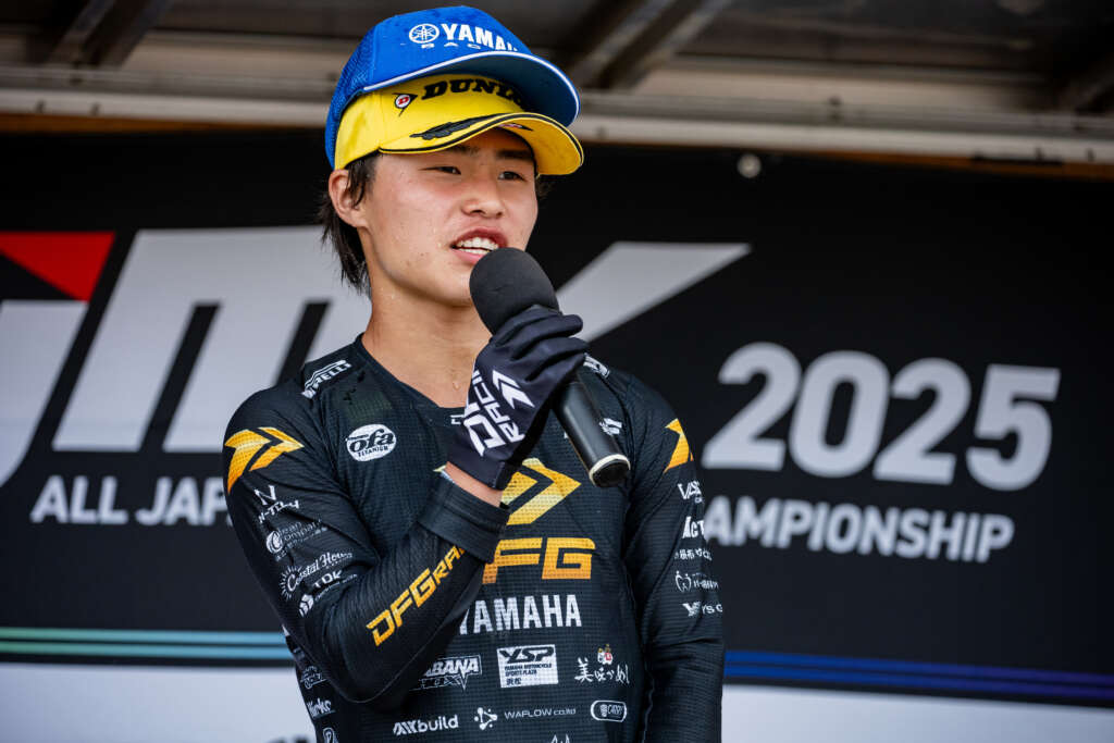 「IA1にステップアップして1年目で表彰台に上がれたことはよかったですが、まだ前にいるので、素直には喜べないですね。開幕戦以降調子が悪くて、今までできていたことができなくなってしまいました。3ヶ月のインターバル期間でライディングやトレーニングを全部見つめ直して、できなかったことをまたできるようにしたことと、さらに速くなるために練習を重ねてきました。第5戦の名阪では全ヒート転んでしまいましたが、調子は悪くなくて、そこからさらに今大会に向けて乗り込んで、全日本前に行われた関東選手権にも出場しました。ライディングなどを見てもらっているトレーナーさんと改善点を話して煮詰めていった成果が出たと思います。ジェイさんに抜かされてから後ろを走っている中で、自分よりも1〜2秒速いペースだったり、セクションに対するアクセルの開け方だったりを間近で見ることができて、彼のリズムを学ぶことができました。ジェイさんのペースは速いのですが、疲れなくて、この気づきは自分にとっても収穫でした。最終戦は地元で乗り慣れているコースなので、自分の走りに集中して、ベストを尽くしたいです」