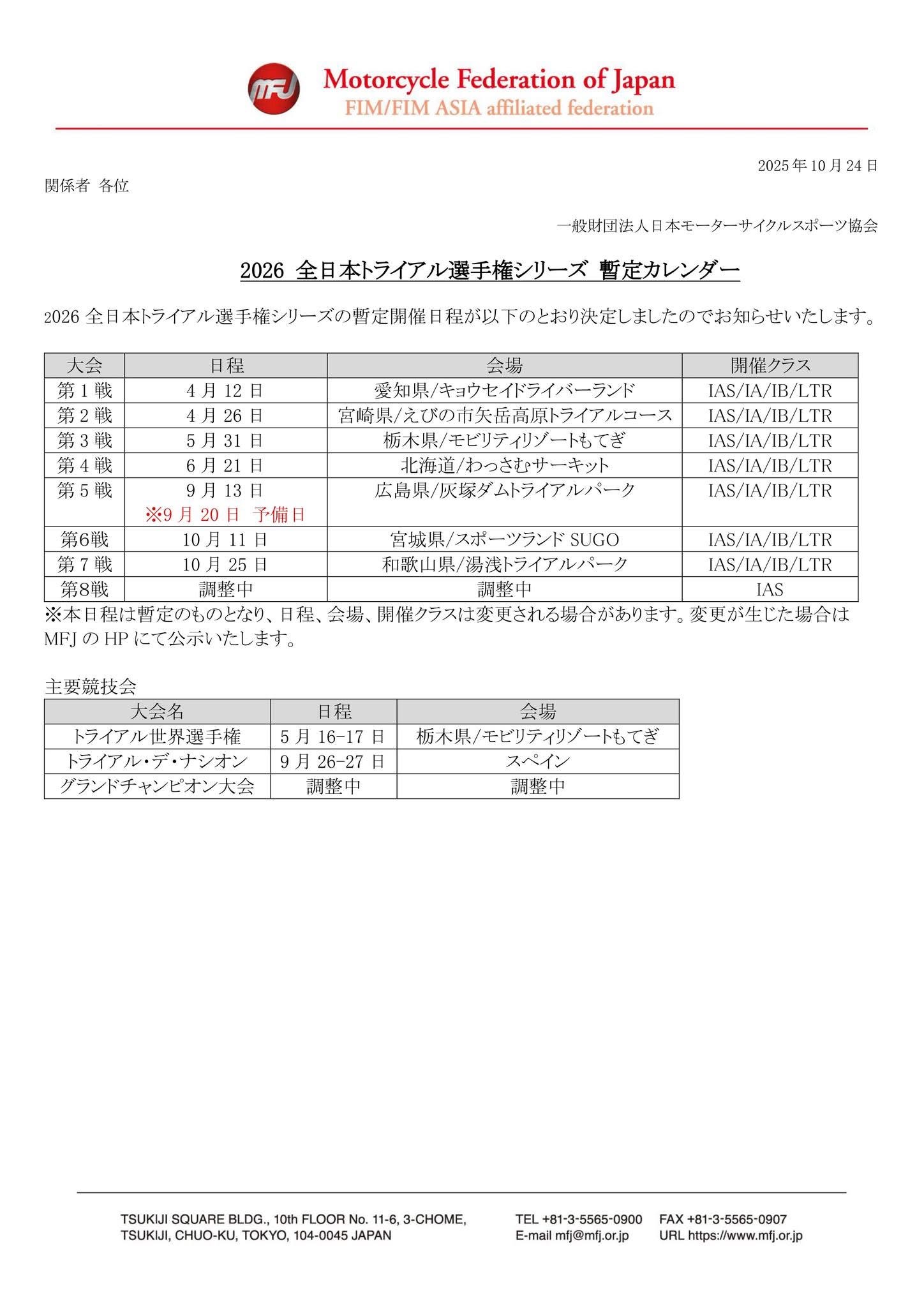2026MFJ全日本トライアル選手権シリーズの暫定開催日程が決定しました。国際A級スーパークラスは全8戦、国際A級/レディース/国際B級は全7戦で行われます。