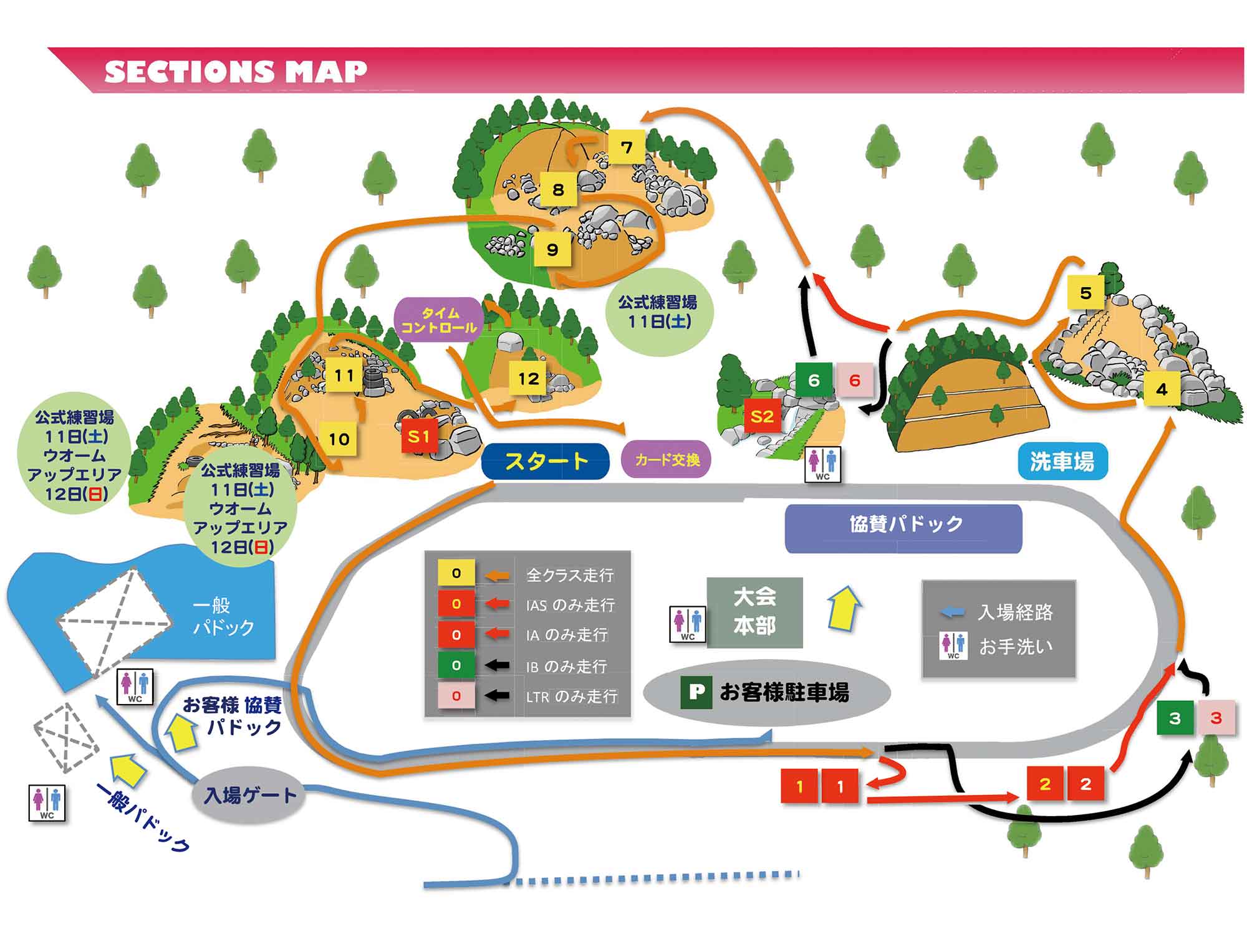 黄色のセクションは全クラストライ、赤はIA・IASのみトライ。緑とピンクはオープントロフィー・IB・レディースのみトライするセクションになります。そしてIAS上位10名がSS(スペシャルセクション)に進みます。